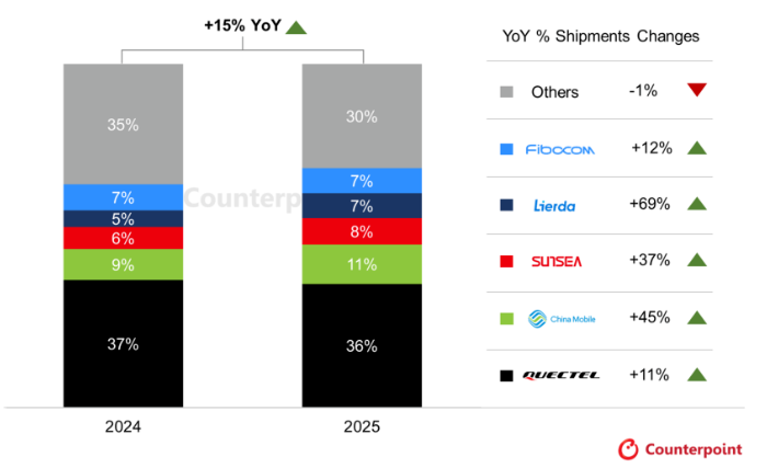 中国厂商在全球蜂窝物联网模组市场中占据了绝对优势。Counterpoint发布的报告显示,2025年全球蜂窝物联网模组出货量同比增长了15%。智能计量、资产追踪、POS终端、E以及汽车领域是核心需求来源。中国市场因为POS、资产追踪、安防应用的需求强劲,出货量同比增长了15%,持续领跑全球市场。这种产业优势为车载定位器的出口贸易提供了强大的供应链支持。