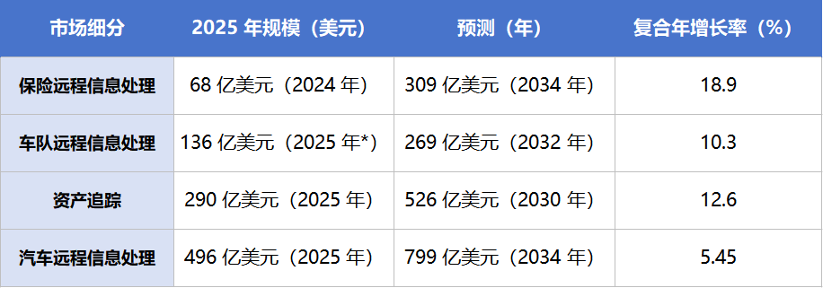 2025年,保险远程信息处理市场规模预计达68亿美元,并以近19%的年复合增长率冲向2034年的309亿美元。与此同时,车队远程信息处理市场预计在2032年达到269亿美元;更广泛的资产追踪市场规模则在2025年预计为290亿美元,到2030年将增至526亿美元。